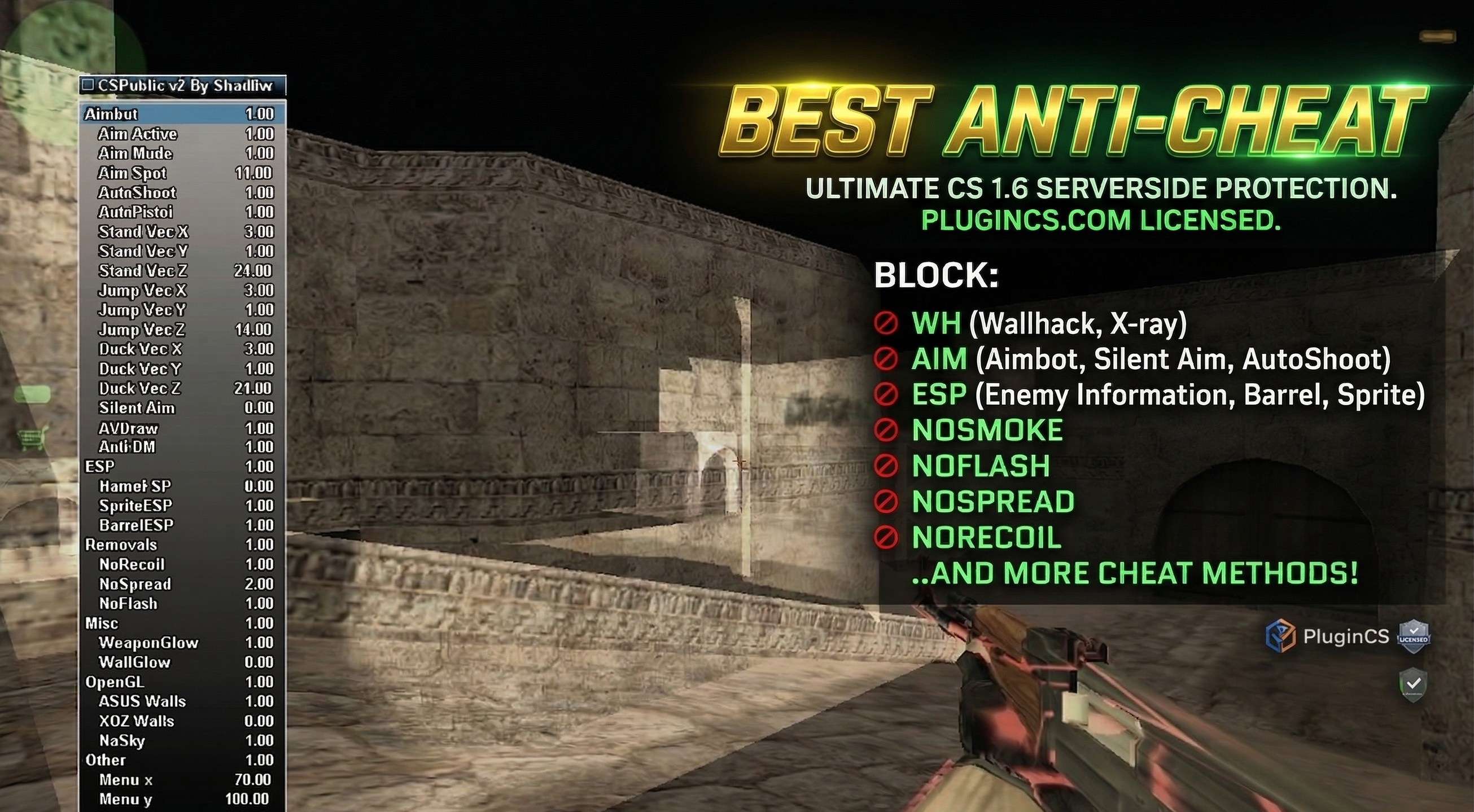 Aimbot Entity Deception (Обман Аимботов): Интеллектуальный плагин кс 1.6 создает невидимые, ложные цели, которые идеально имитируют поведение реальных игроков. Автонаведение читера сходит с ума, пытаясь захватить фантомов, делая стрельбу хаотичной и паливной.