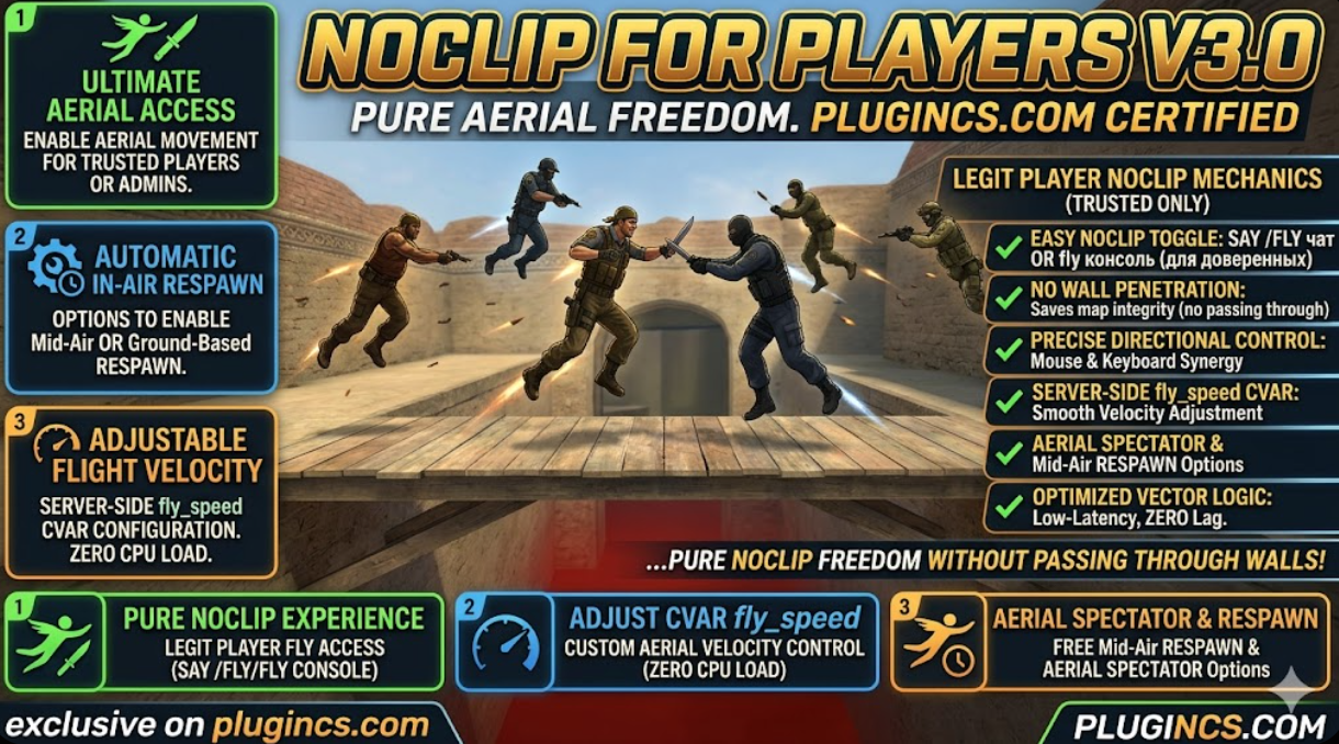 Этот плагин — маст-хэв для серверов типа Jailbreak, Creative, Knife или для администраторов пабликов. Он дает полный контроль над перемещением, не создавая дыр в защите карты. Код написан профессионально, без лишних циклов и с идеальной обработкой отключения игроков. Чтобы игроки летали стабильно и без лагов — выбирайте Noclip For Players.